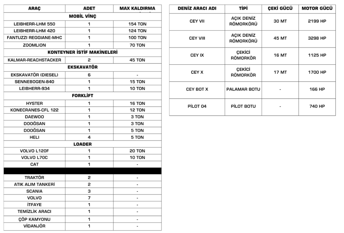 Yolcu/Hızlı-Yolcu Gemileri, Hızlı-Kargo Gemisi, Dökme Yük Gemisi, Genel Kargo gemilerine hizmet veren Ceyport Taşucu Limanı’nda bulunan ekipman ve teçhizatlar: